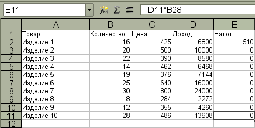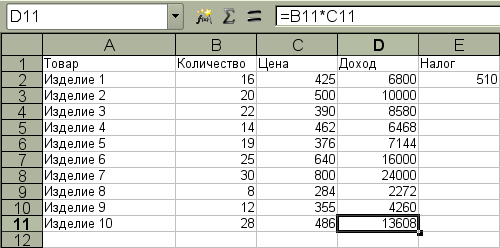 Выделите ячейку с формулой, рассчитывающей величину дохода для 1-го изделия (D2).