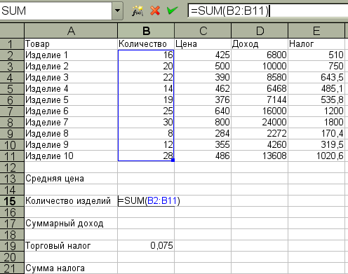Установите табличный курсор в ячейку общего количества изделий – В15.