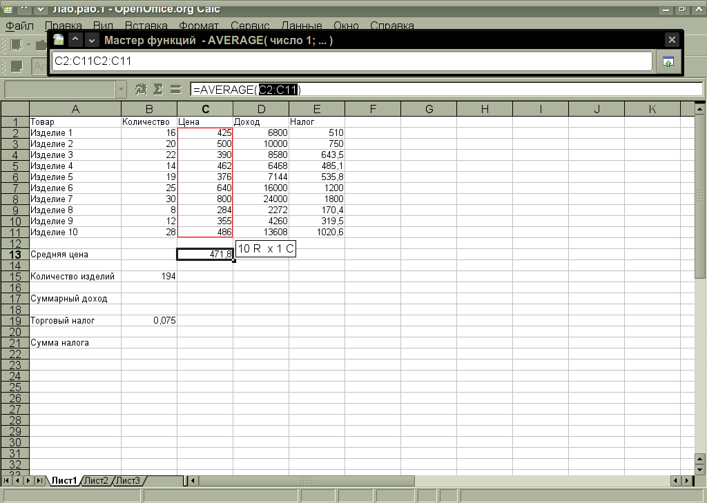 В рабочем листе выделите диапазон ячеек, среди значений которых требуется найти среднее: С2:С11.