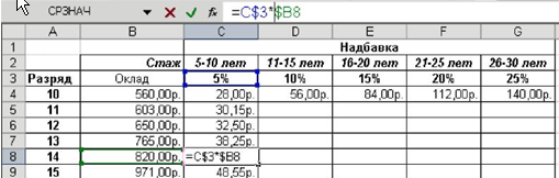 В ячейку С4 введите формулу: =C$3*$B4. Данная формула содержит две смешанные ссылки на ячейки. В ссылке С$3 координата столбца является относительной, а координата строки – абсолютной. В ссылке $B4, наоборот, координата столбца является абсолютной, координата строки – относительной.