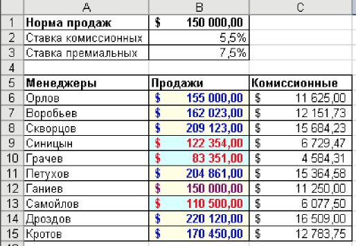 Например, на рисунке представлена таблица, в которой с помощью условного форматирования заданы различные форматы для значений продаж выше нормы, ниже нормы и равных норме.