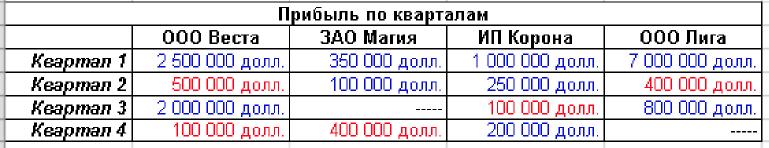 Содержимое ячейки, отформатированной с помощью этого шаблона, будет отображаться различным цветом в зависимости от находящегося в ней числового значения. В данном случае положительные числа будут зелеными, отрицательные – красными, нуль – черным, текст – голубым рис. 34.