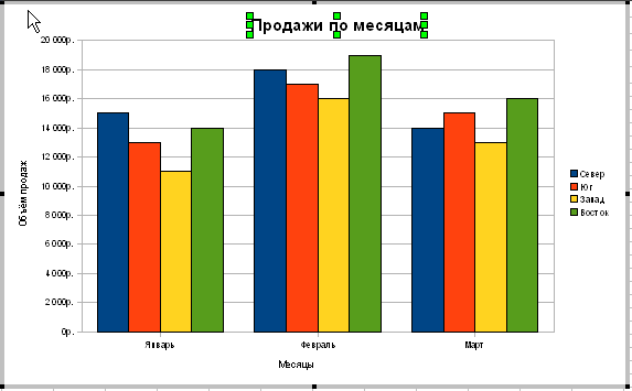 Некоторые элементы диараммы могут быть передвинуты. Выберите элемент диаграммы, например, ее заголовок, щелкните по нему указателем мыши. При этом вокруг заголовка должна появиться рамка с расположенными на ней маркерами рис. 10.