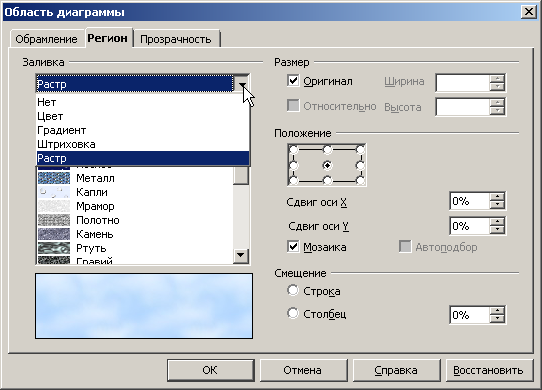 Для изменения заливки щёлкните по свободной области диаграммы правой кнопкой мыши и выберите в меню пункт «Свойства обьекта» рис 11. В диалоговом окне «Область диаграммы» на вкладке «Регион» измените цвет заливки области рис. 12. Например, выберите в меню «Заливка» пункт «Растр» и в списке выберите одну из текстурных заливок .