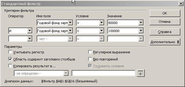 Нажмите кнопку ОК. Таким образом, вы вывели список сотрудников с годовым фондом зарплаты в диапазоне от 80 000р. до 100 000р.