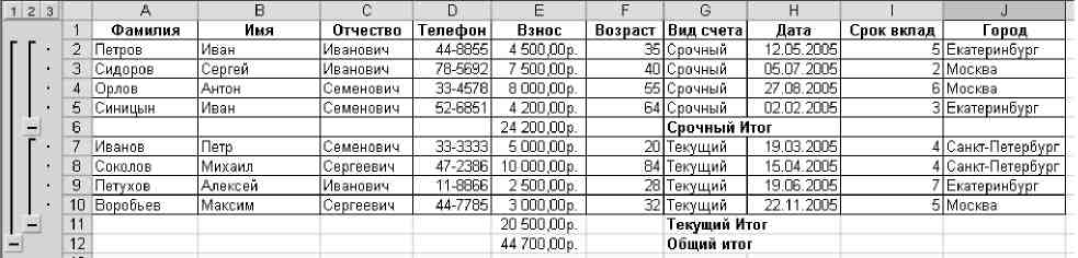 Подведите промежуточные и общие итоги по полю Вид счета, определив суммарные значения взносов.