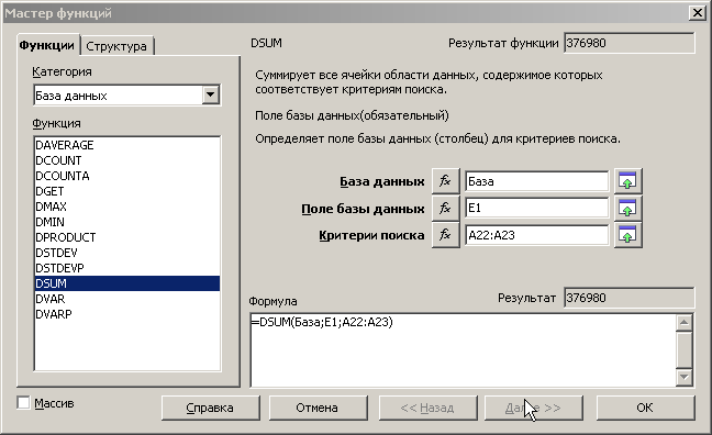 =Д-функция (база_данных; поле; критерий)