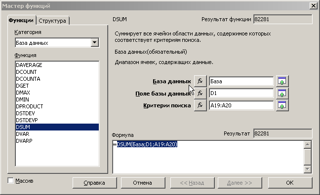 Активизируйте ячейку В20. Вызовите Мастер функций, выберите категорию функций Работа с базой данных и функцию DSUM.
