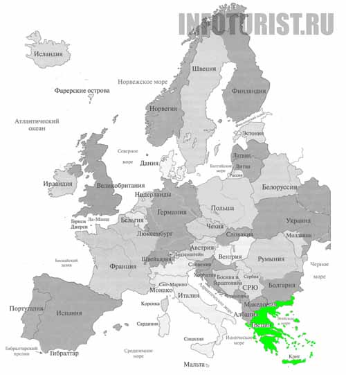 Греция, государство в юго-восточной Европе, занимающее южную часть Балканского полуострова и многочисленные острова в Эгейском и Ионическом море, граничит с Албанией, Македонией, Болгарией и Турцией.