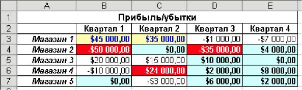 С помощью условного форматирования выделите прибыль, меньше 10 000р., прибыль больше 30 000р. и убытки больше -2000 р. Имейте ввиду, что прибыль – это значения больше нуля, убытки – значения меньше нуля.