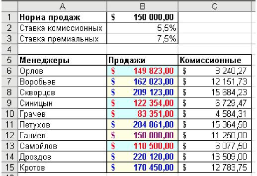 Например, на рисунке представлена таблица, в которой с помощью условного форматирования заданы различные форматы для значений продаж выше нормы, ниже нормы и равных норме.
