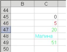 Содержимое ячейки, отформатированной с помощью этого шаблона, будет отображаться различным цветом в зависимости от находящегося в ней числового значения. В данном случае положительные числа будут зелеными, отрицательные – красными, нуль – черным, текст – голубым рис. 34.