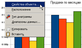 Для изменения заливки щёлкните по свободной области диаграммы правой кнопкой мыши и выберите в меню пункт «Свойства обьекта» рис 11. В диалоговом окне «Область диаграммы» на вкладке «Регион» измените цвет заливки области рис. 12. Например, выберите в меню «Заливка» пункт «Растр» и в списке выберите одну из текстурных заливок .