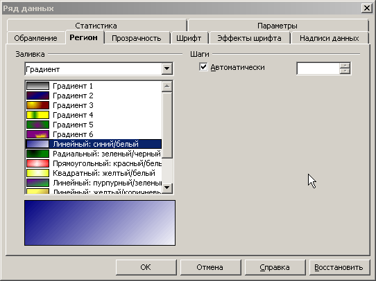 Измените формат элемента «Область построения диаграммы». Например, на вкладке «Регион» установите градиентную заливку из двух цветов рис. 14.