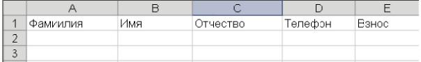 Введите заголовки столбцов в ячейки: А1 - Фамилия, В1 - Имя, С1 - Отчество, D1 -Телефон, Е1 - Взнос. Установите ширину столбцов так, чтобы данные в них отражались полностью рис. 1.
