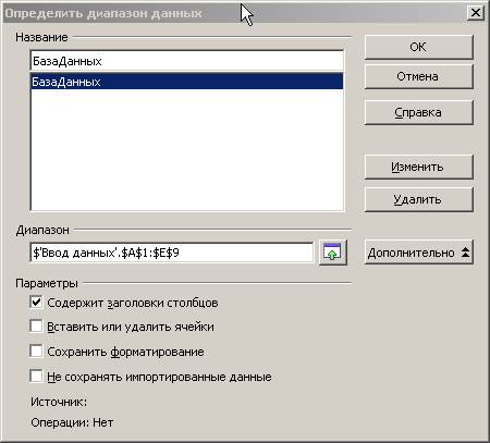 Выделите любую ячейку в строке заголовков таблицы (строка 1) и выберите команду Данные⇒Определить диапазон. Введите имя диапазона в поле название, программа автоматически определит диапазон, который при желании можно поменять нажав на кнопку справа от поля «Диапазон» и выделив нужный диапазон базы данных, если вы хотите использовать первую строку для заголовков то поставьте галочку напротив «Содержит заголовки столбцов» рис. 2. Щелкните на кнопке ОК.