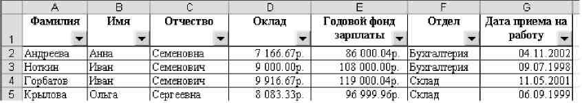 Из полученного списка отберите тех сотрудников, которые были приняты на работу, например, не ранее 01.01.2000 года. Используйте для этого опцию (Стандартный фильтр…), критерий меньше (<) и значение критерия 01.01.2000.