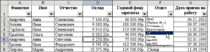 Щелкните на кнопке автофильтра в ячейке Отдел. Список раскроется и покажет все значения, содержащиеся в этом столбце рис. 9.