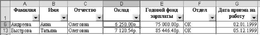 Нажмите кнопку ОК. Таким образом, вы вывели список сотрудников с годовым фондом зарплаты в диапазоне от 80 000р. до 100 000р.