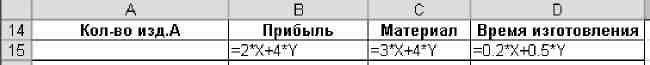 В ячейку В15 скопируйте формулу для расчета прибыли (ячейка В6). Таким же образом скопируйте формулы для расчета расхода материала и времени изготовления рис. 20. Помните, что формулы в таблице подстановки должны в точности повторять формулы в исходной таблице поиска решения.