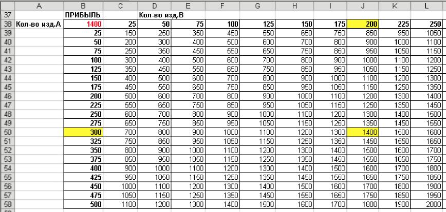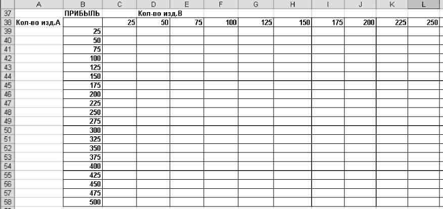 Оформите таблицу подстановки: введите по строкам значения количества изделия А от 25 до 500 с шагом 25, по столбцам - значения количества изделия В от 25 до 500 с шагом 25 рис. 22.