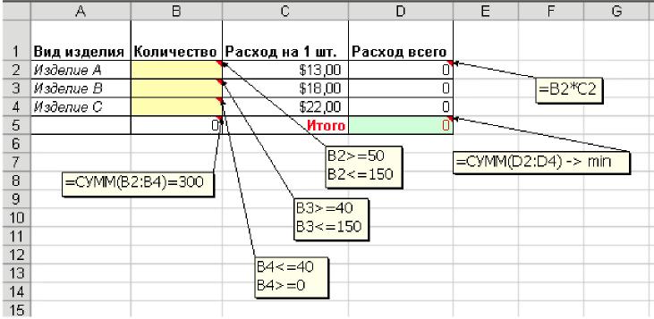 Оформите таблицу подстановки рис.138. Вводите количество изделия А от 25 до 500 с шагом 25 (используйте функцию Автозаполнение).