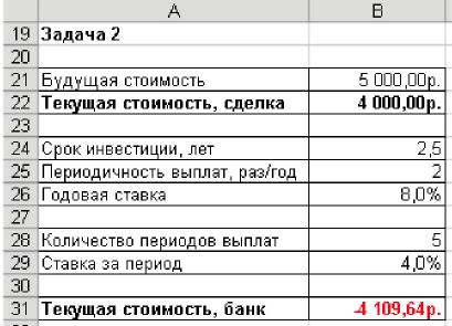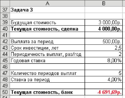 Функция возвращает значение -4 451,82. Это означает, что нужно вложить в банк 4 451,82р. под 8,0% годовых сегодня, чтобы получить 5 000р. в течение следующих 5 лет. Поскольку в предлагаемой сделке вклад равен 4 000р., можно считать, что совершить сделку выгоднее, чем вложить деньги в банк.