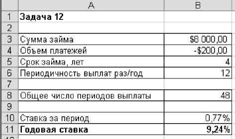 Организация сделала займ в размере $8000 на 4 года. Платежи должны производиться каждый месяц в размере $200. Определите, под какой процент взят займ. Учтите, что будущее значение инвестиции для займа составляет 0.