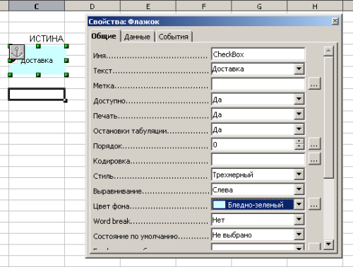 Если во вкладке данные не указывать значение индекса, например 1 ,если флажок установлен и 0, если флажок снят, то в связанной ячейке будет значение ИСТИНА, если флажок поставлен, или ЛОЖЬ, если флажок снят.