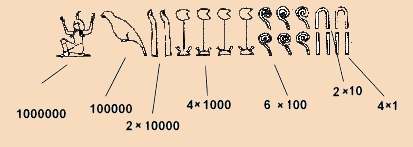 Система счета древних египтян насчитывает семь знаков, передающих разряды чисел. Запись цифр внутри каждого из разрядов производилась простым увеличением количества знаков по принципу простейшего сложения.