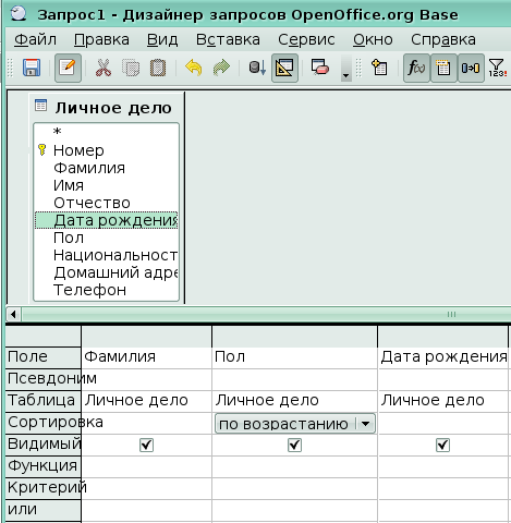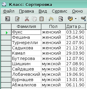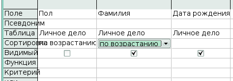 5. Осталось добавить сортировку по фамилии. OpenOffice.org Base выполняет сортировку слева направо. Поле Пол должно быть перемещено влево от поля Фамилия, чтобы сортировка сначала выполнялась по полу и только потом по фамилиям.