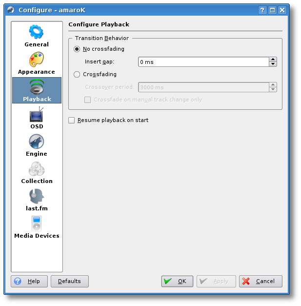 Вы можете настроить переход amaroK с одной песни на другую. создаёт задержку, устанавливаемую в миллисекундах. создаёт плавный переход между песнями, который также устанавливается в миллисекундах.