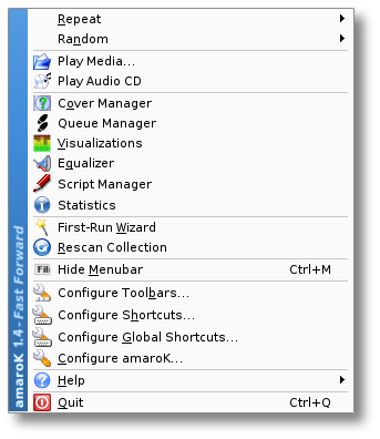 Меню под правой клавишей мыши, как несложно догадаться, вызывается щелчком по правой клавише мыши над окном проигрывателя, либо щелчком по кнопке Меню в окне окне списка (если её нет, щёлкните правой кнопкой мыши на панели инструментов списка). Это меню используется для доступа ко всем возможным настройкам amaroK.