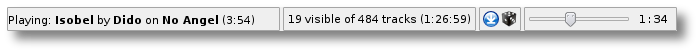 В панели состояния отображается разная полезная информация о списке: название текущей композиции, общее количество композиций в списке, общее время воспроизведения, статус режимов повтора и случайного выбора. Там же находится ползунок перемещения во времени в рамках воспроизводимой композиции. Статус повтора и режима случайного выбора меняется двойным щелчком по соответствующим частям панели состояния.