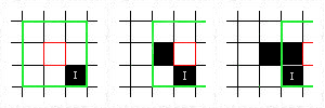 In this image, the studied pixel has a red border and the studied matrix has a green border. I hope you have understood how to go on with the process and get a 3x3 pixel block: when the “I” pixel is inside the green border, the studied pixel turns to black.