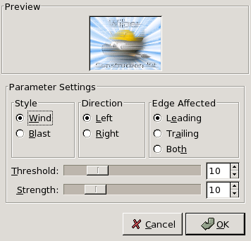 You can only set the wind in two directions, either Left or Right. However, you can control which edge the wind will come from using the values Leading, Trailing or Both. Because Trailing will produce a black wind, it creates a less convincing motion blur than Leading, which will produce white wind.