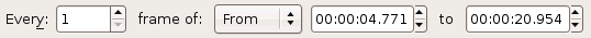 You select the frames of your video at the top of the Export page. There are three principal ways to select frames; which one you use is determined by the top drop-down box. The default choice is All , which will export all frames in your project. Next choice is Current which will export the current frame (probably mostly useful when exporting stills). The current frame is the last one viewed in the Edit or Trim page. Finally there is From/To which allows you to set the beginning and end times ( Chapter 5, Understanding Time in Kino ). You can also choose to not export every frame, but, for example, only every second or third frame. You do this by changing the number in the Every spinner. The default is to export every frame.