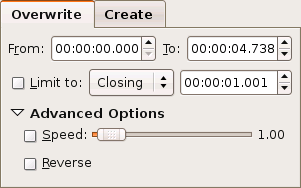 Overwrite affects a range of frames in your existing movie and then non-destructively replaces those frames. By non-destructive, we mean that Kino merely automates the process of editing the newly rendered file into place rather than actually modifying any existing DV file. You can set an overall time range, and then limit the range to the beginning or end for a specific duration. Often, the Limit to option is easier than specifying the exact range. Some notes follow: