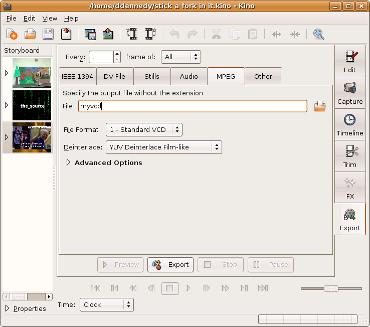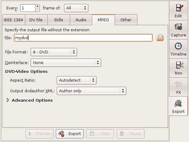 Click Advanced Options to show more options. Video Pipe , Audio Encoding , and Multiplexer are fields that let you supply your own arguments to the different mjpegtools programs used during export.