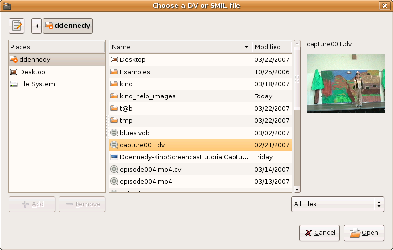 Start editing by opening a clip by choosing -> from the menu or toolbar or by dragging a clip from your file manager (e.g. Nautilus or Konquerer) and dropping it onto the Kino window.