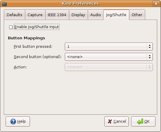 Button Mappings : Kino will let you assign actions to the buttons on your jog/shuttle. Simply press the button combination you wish to assign an action to, and select the action from the bottom list of actions. Alternatively you can select the buttons by using the lists. You can assign actions to single buttons or combinations of two buttons. In the latter case then please note that if you have assigned an action to a single press on button 1 and also to a combination of 1 followed by 2, Kino will perform both actions if you press 1 followed by 2. You can clear an action by selecting the <none> action.