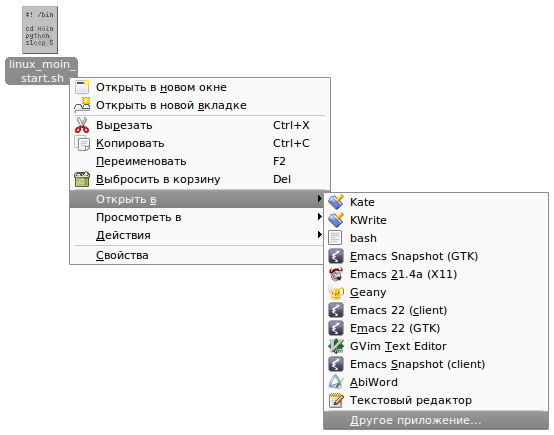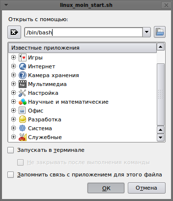 - Чтобы выполнить командный сценарий, можно открыть содержащую его папку в файловом менеджере и кликнуть по ней. В случае, когда непосредственный запуск командных сценариев запрещён, необходимо кликнуть правой кнопкой и указать программу /bin/bash как программу, которой необходимо выполнить файл.